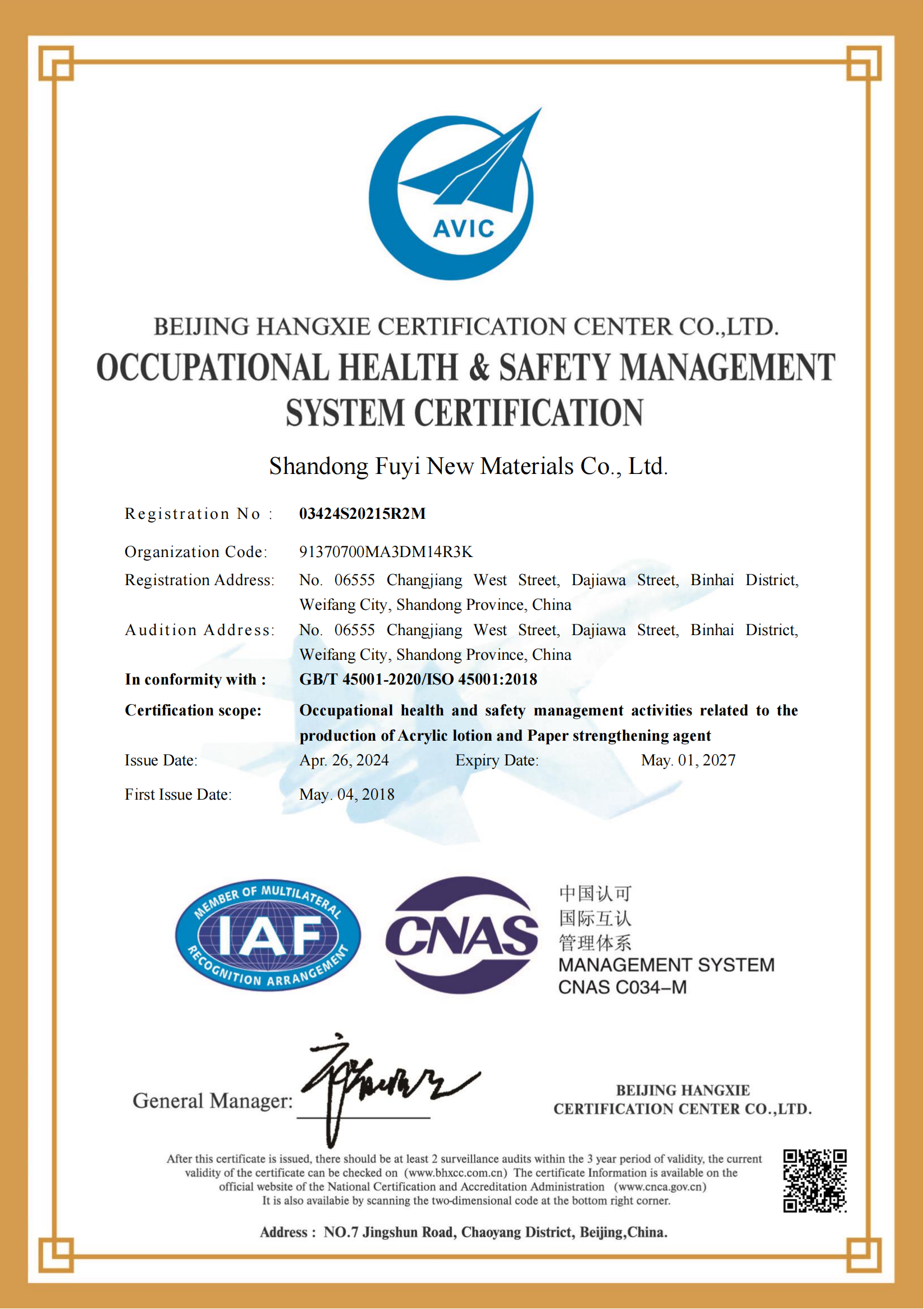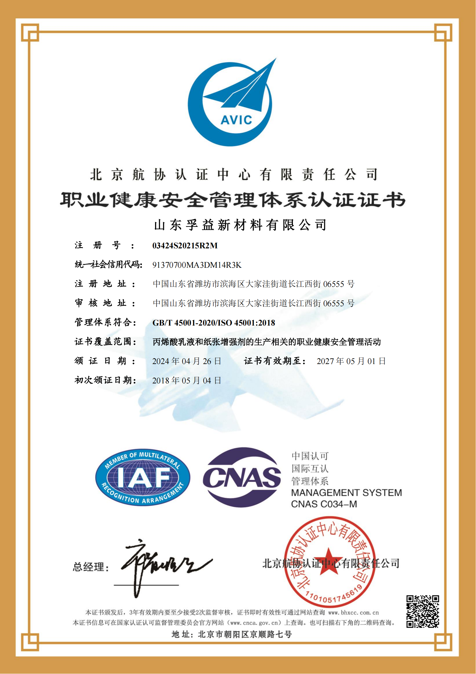 職業(yè)健康安全管理體系認(rèn)證證書