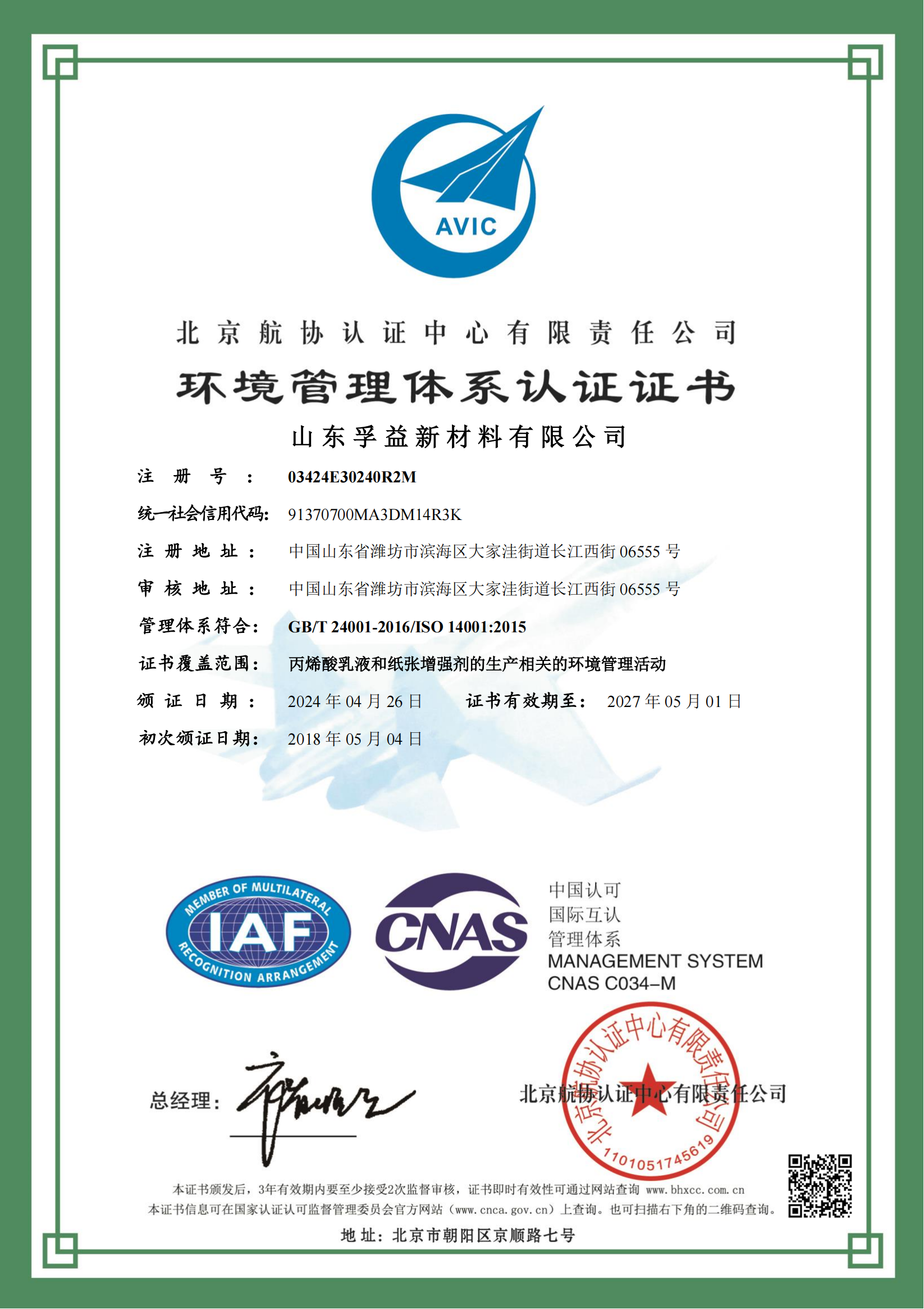 環(huán)境管理體系認(rèn)證證書